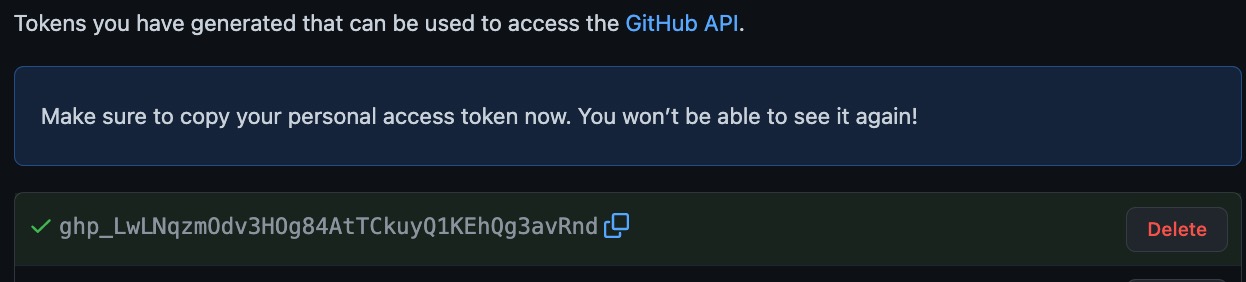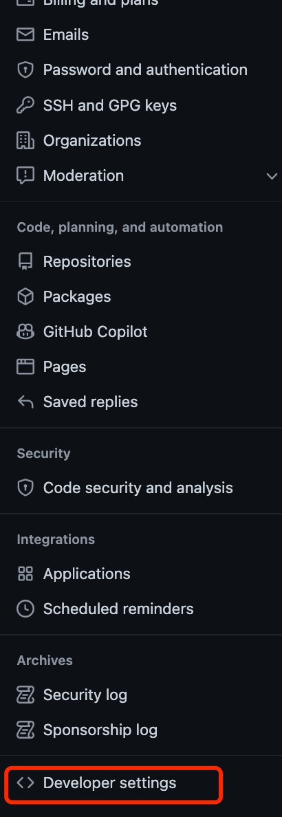 Settings,进入Settings后,点击左侧下方的Developer settings,网页跳转后,选左边的Personal access tokens,点击Generate a personal access token,Note这里填写为什么创建这个Token,可随意填写,下方勾上repo即可。然后滑到最下方点击Generate token。然后会生成一条Token信息,生成的Token只会出现一次,记得复制保存。(省略了一些简单的步骤的截图,大家应该都懂)