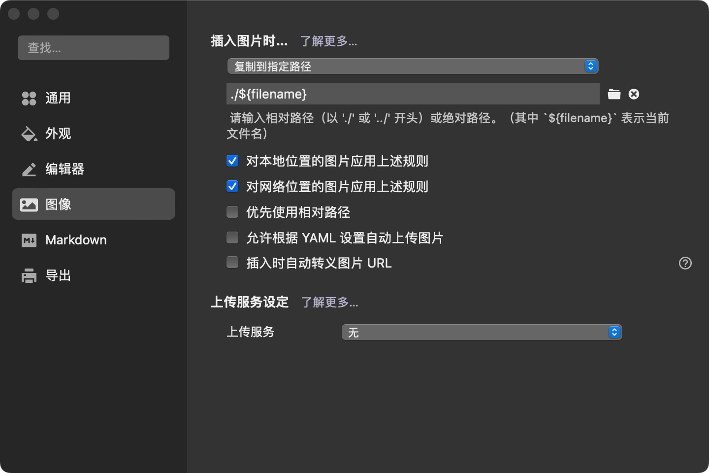 我使用的Typora编辑MarkDown文件,通过ctrl + , 打开Typora的设置,并按图片中完成相关设置。